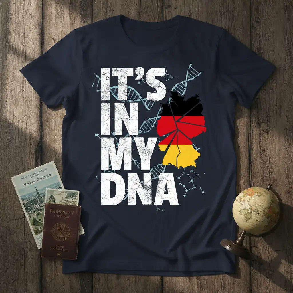 This unique t-shirt design is a vibrant tribute to German heritage and identity. The phrase “IT’S IN MY DNA” is presented in bold, eye-catching white lettering, set against a backdrop that beautifully incorporates the German flag colors within the outline of Germany itself. Surrounding the text and map are detailed graphics of DNA helices and molecular structures, symbolizing the deep, inherent connection to one’s roots.