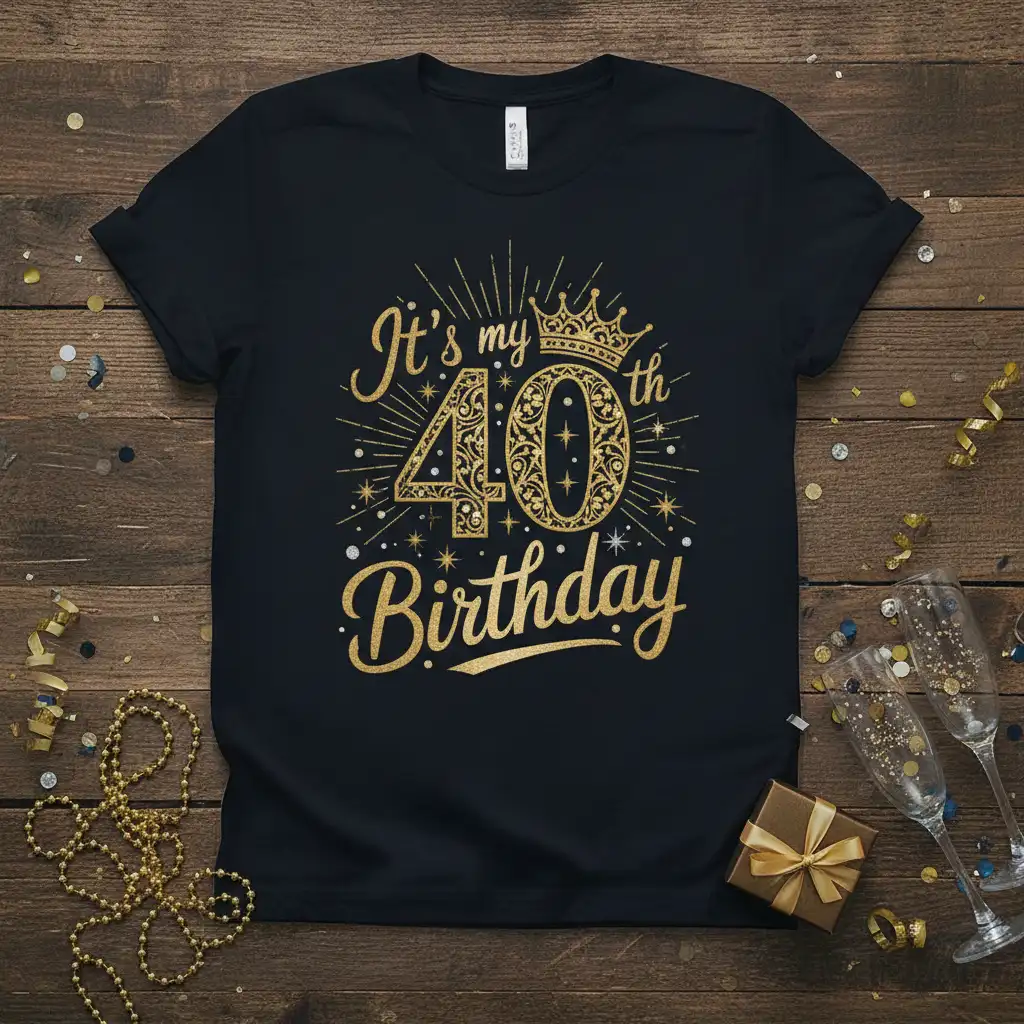 In addition to a great fit, you can choose from several classic colors to match your personal style or party theme. Select from Black, Red, Navy, White, Dark Heather, or Royal. Each color provides a stunning backdrop for the brilliant gold “It’s my 40th Birthday” design, ensuring you stand out on your special day.