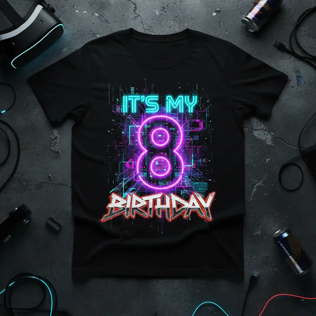 It’s My 8 Birthday, and this t-shirt is the ultimate way to celebrate! Designed for the young gamer or tech enthusiast turning eight, this shirt brings a vibrant neon aesthetic to their special day. The striking design features glowing text and intricate digital patterns, making it a standout piece for any birthday party or celebration. It’s more than just apparel; it’s a statement of their growing personality and interests. This tee is perfect for creating memorable birthday photos and ensuring they feel absolutely fantastic as they embark on their eighth year.