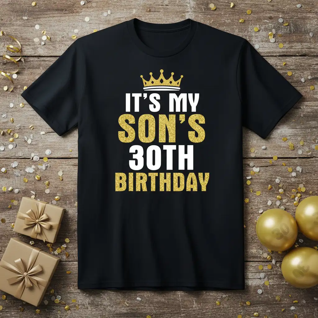 The journey to thirty is a remarkable one, filled with growth, achievements, and unforgettable memories. This t-shirt serves as a fun and stylish way for parents to be part of the celebration, showing their support and love. The bold “IT’S MY SON’S 30TH BIRTHDAY” text, paired with a glittering gold crown, signifies the importance and celebratory nature of this thirtieth milestone. It’s designed to be a conversation starter and a symbol of parental pride during the festivities.