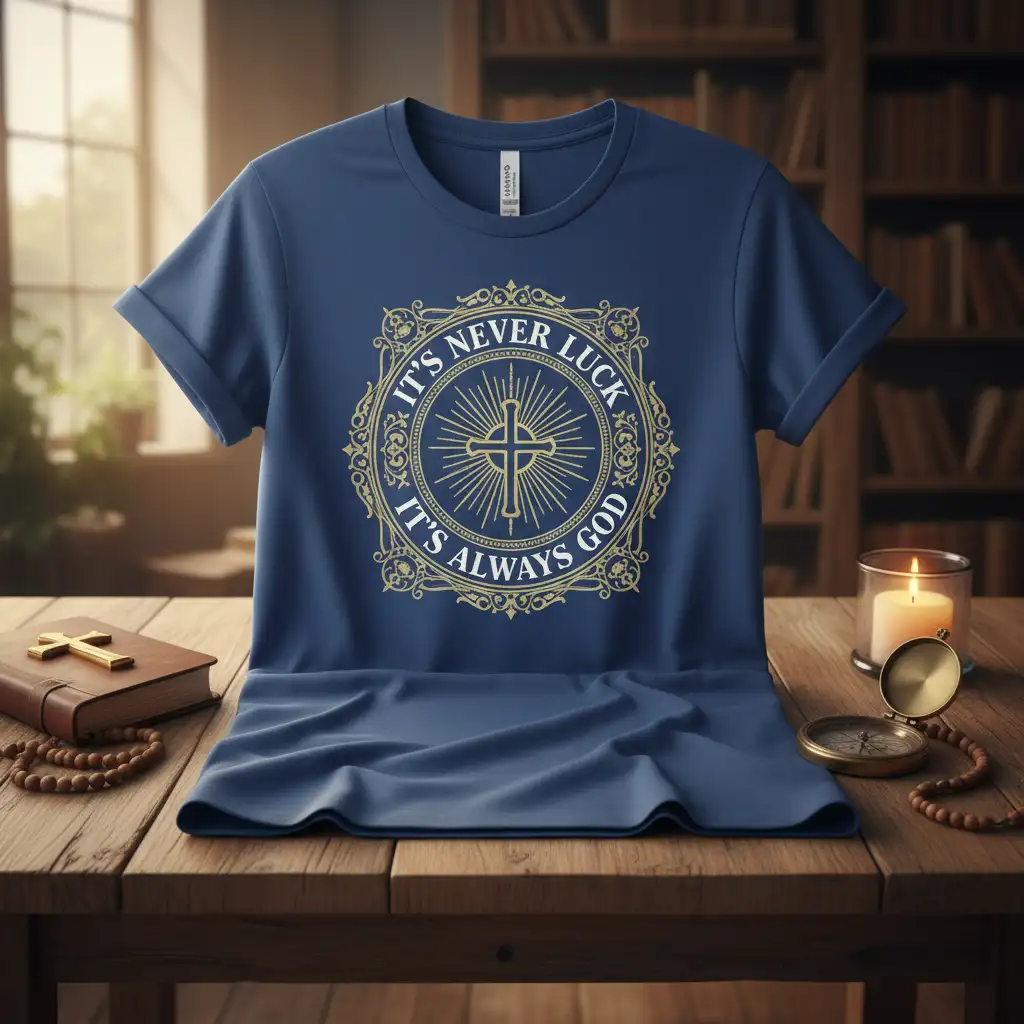 This IT’S NEVER LUCK IT’S ALWAYS GOD design itself, featuring a radiant cross within an ornate circular emblem, is both visually appealing and spiritually significant. It symbolizes light, guidance, and the enduring strength found in divine connection. Wearing this shirt is a way to visibly carry your spiritual convictions and inspire others through your outward expression of belief.