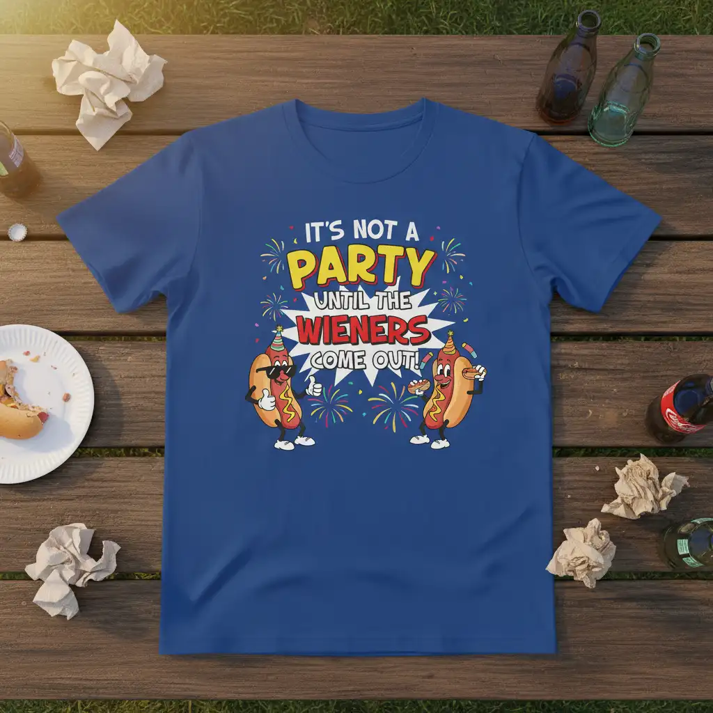 It’s Not A Party Until The Wieners Come Out! This statement tee is the ultimate way to declare that the real fun begins when the hot dogs arrive. Perfect for any barbecue aficionado, summer celebration, or casual get-together, this shirt guarantees smiles and laughter. It embodies the spirit of good times, great food, and even better company. Wear it proudly to your next cookout and let everyone know your party motto.