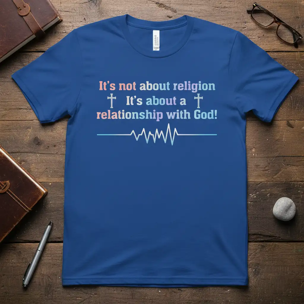It’s not about religion It’s about a relationship with God! This powerful statement tee is designed for individuals who seek to express their deep spiritual connection and personal faith. It moves beyond the confines of organized religion to emphasize the direct, heartfelt bond with the divine. The design features a gradient of colors and symbolic graphics, making it a unique and meaningful addition to any wardrobe. It serves as a constant reminder of the personal journey of faith and the intimate relationship one can cultivate with God.