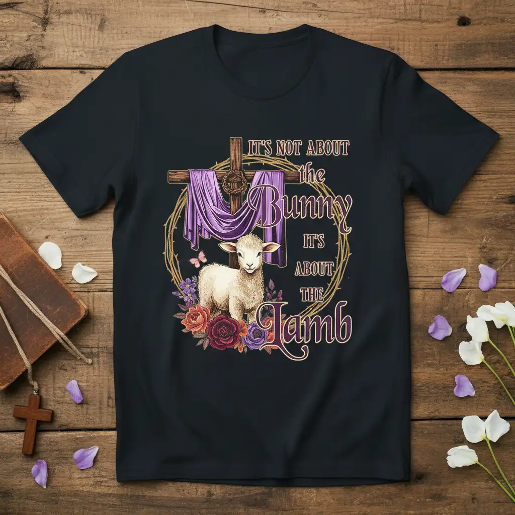 This design thoughtfully contrasts the popular imagery of Easter with its deeper religious context. It gently guides the wearer and observers towards understanding that the essence of the holiday lies in the sacrifice and resurrection of Jesus Christ, symbolized as the Lamb. The accompanying graphics, including the cross and the lamb, are powerful visual cues that reinforce this central theme.