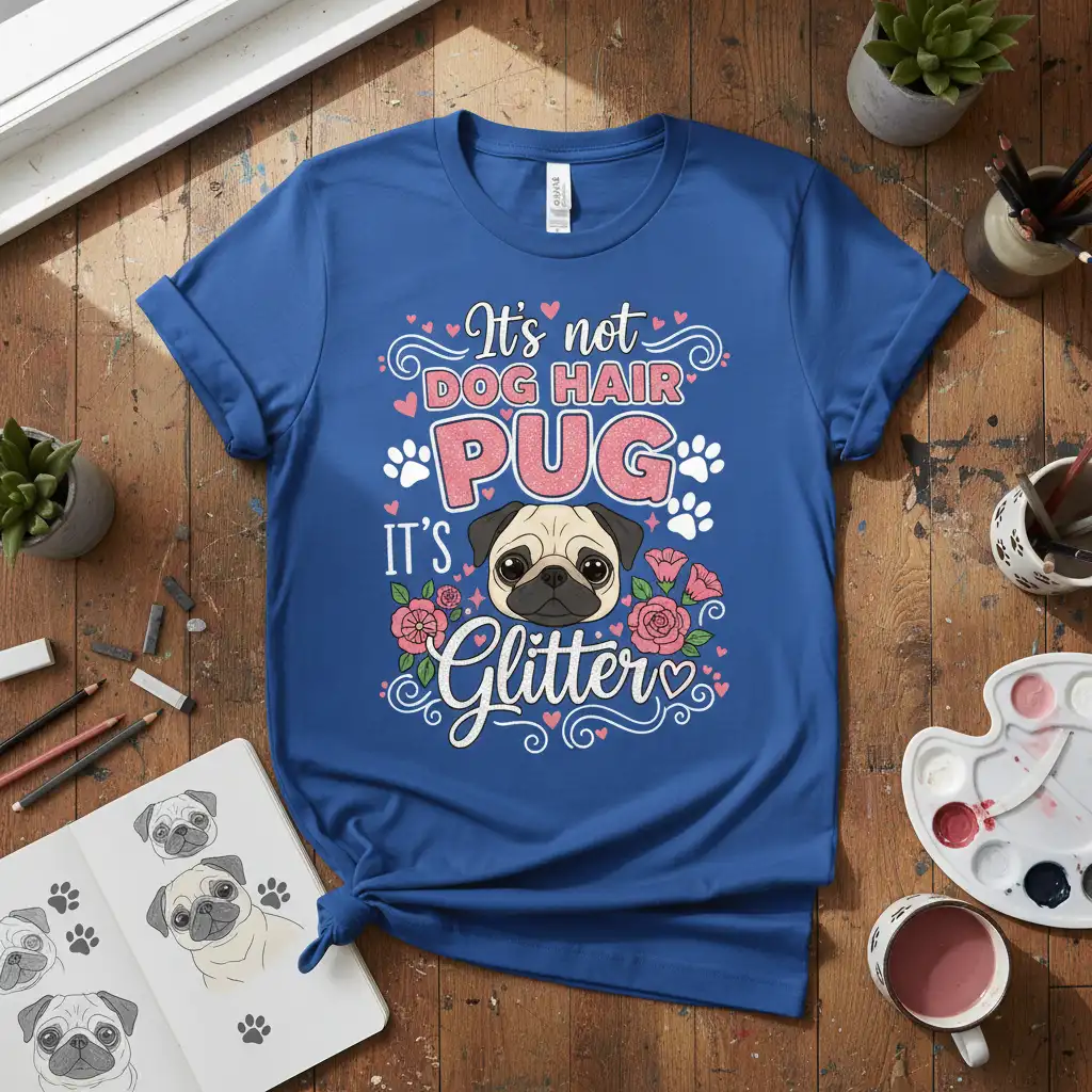 This design is perfect for pug moms, pug dads, and anyone who simply adores the breed. It’s a fantastic conversation starter at dog parks, pet-friendly cafes, or casual get-togethers. The playful “glitter” theme adds a touch of magic, suggesting that every pug, no matter how much they shed, brings an undeniable sparkle to life. It’s a wearable piece of art that celebrates the unconditional love and happiness pugs provide.