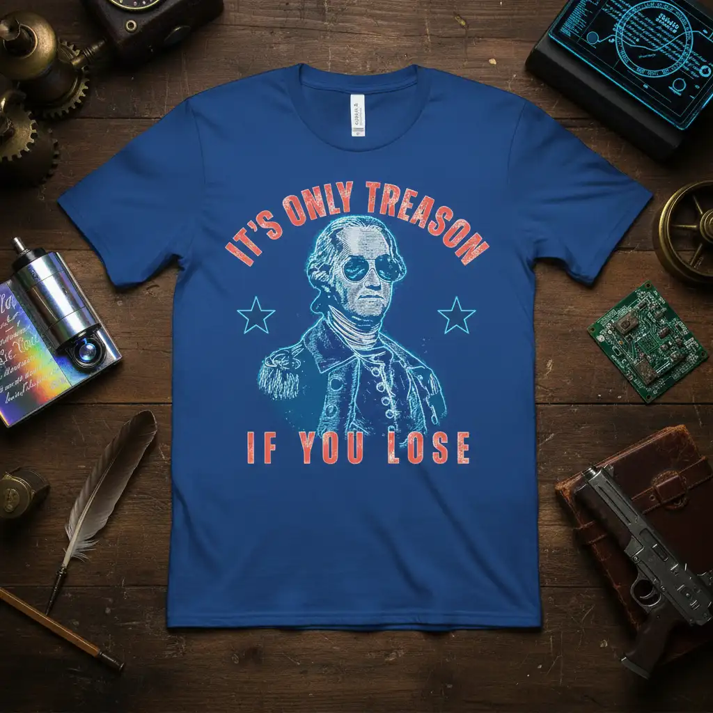 Make a bold statement with the “It’s Only Treason If You Lose” George Washington T-Shirt. This unique tee blends historical charm with modern humor, making it a standout piece for any wardrobe. Crafted for comfort and durability, it’s the perfect conversation starter and a fantastic gift for the history enthusiast or witty friend in your life.
