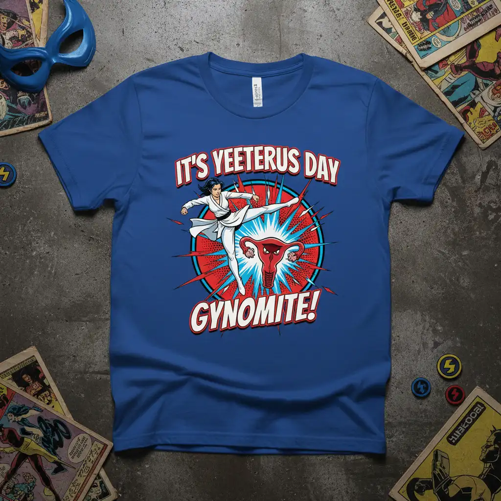 This t-shirt is designed to celebrate the world of gynecology and women’s health with a humorous and powerful statement. The phrase “IT’S YEETERUS DAY GYNOMITE!” is emblazoned across the top, immediately grabbing attention. Accompanying this text is a dynamic illustration featuring a woman executing a powerful karate kick, symbolizing strength and determination. The central graphic is a stylized representation of a uterus, highlighting the focus of the profession.
