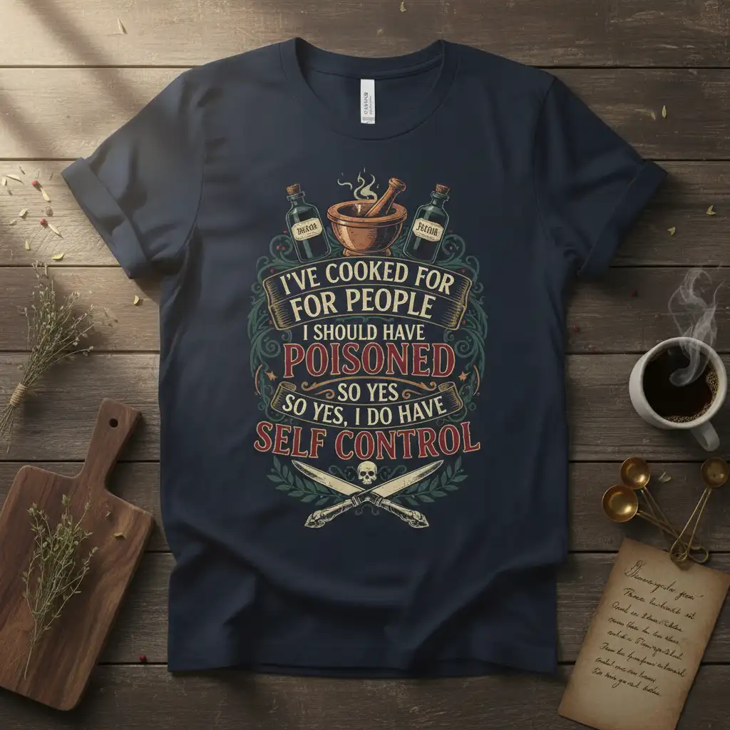 I’VE COOKED FOR PEOPLE I SHOULD HAVE POISONED SO YES, I DO HAVE SELF CONTROL is more than just a phrase; it’s a declaration for the kitchen maverick with a sense of humor. This t-shirt captures the daring spirit of those who spend their time creating culinary masterpieces, often wondering about the potential outcomes. It’s designed for the home cook, the professional chef, or anyone who appreciates a clever twist on everyday life. The intricate design details, including crossed knives and thematic bottles, add a unique flair that stands out. This garment is perfect for expressing a bold personality and a love for food with a side of dark wit.