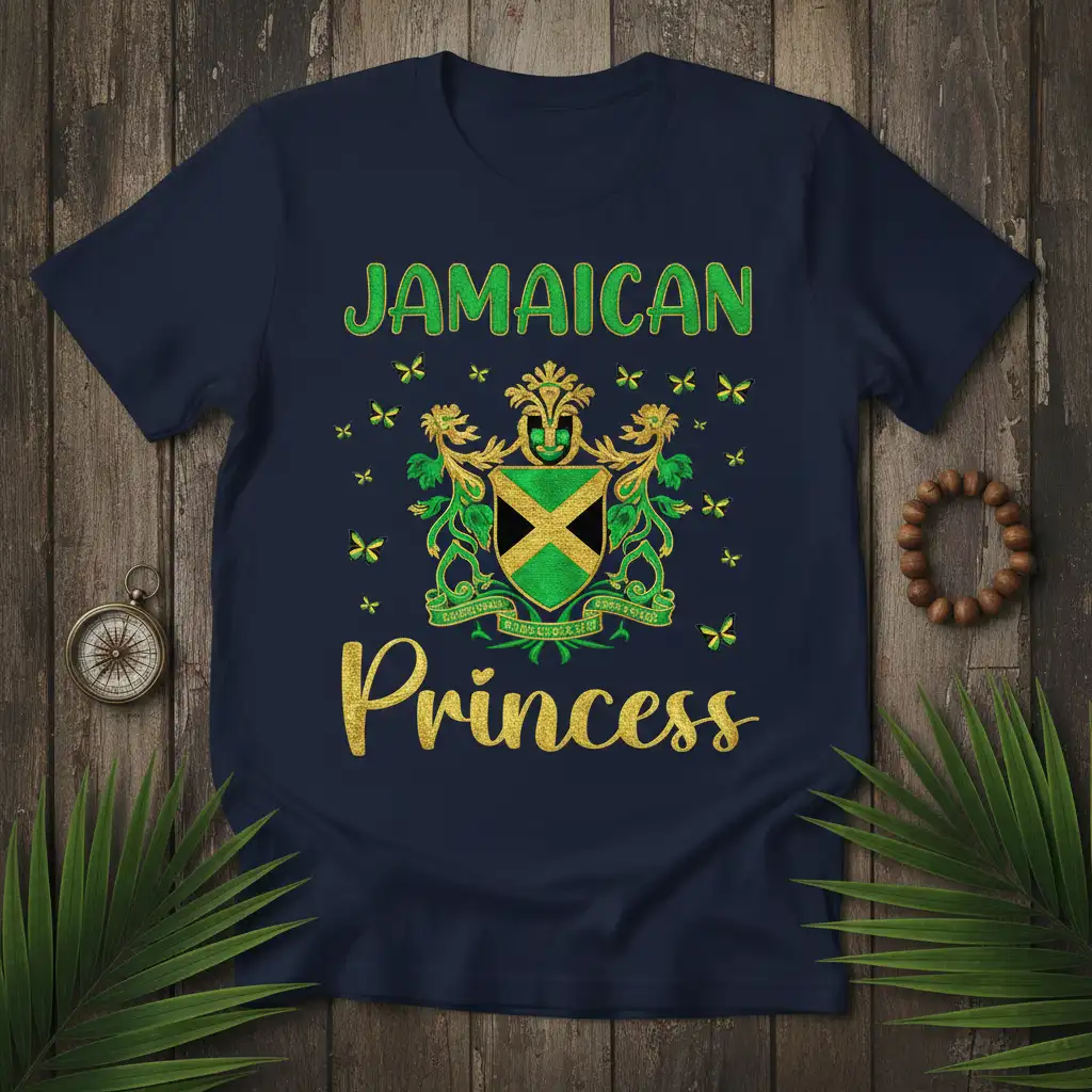 The intricate details of the Jamaican crest are meticulously recreated on this premium t-shirt. Featuring the national motto “Out of Many, One People,” it represents unity and diversity, core values of Jamaican society. The golden accents throughout the crest and the “Princess” text add a luxurious feel, befitting royalty. This design is a sophisticated tribute to Jamaica’s vibrant culture and enduring spirit, making it a treasure for any wearer.
