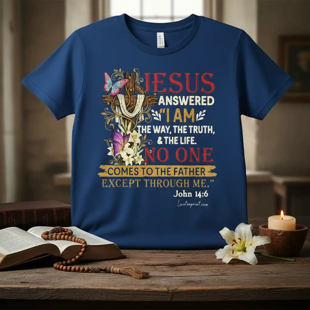 This exceptional t-shirt, featuring the timeless message from John 14:6, is a must-have for anyone who cherishes their Christian faith. It beautifully combines a powerful biblical quote with an aesthetically pleasing design, creating a piece that is both spiritually significant and fashionably relevant. Whether for yourself or as a heartfelt gift, this shirt is sure to inspire and uplift. Order yours today and wear your beliefs with pride, making a statement of unwavering faith wherever you go.