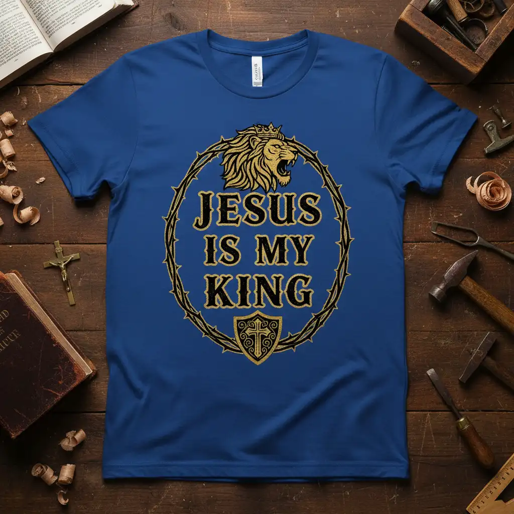 Pick from Black, Navy, Royal, Dark Heather, Red, and White to match your mood and wardrobe staples. Each colorway keeps the JESUS IS MY KING design clear and photo-ready for everyday wear.