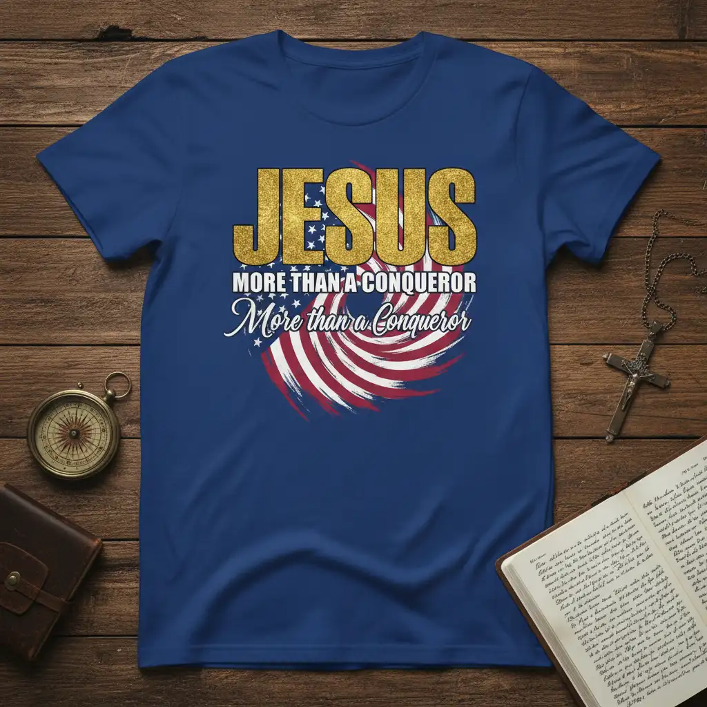 Jesus More Than A Conqueror More Than A Conqueror design is more than just apparel; it’s a statement of faith and a declaration of victory. This powerful Christian t-shirt is crafted for individuals who find strength and inspiration in their spiritual beliefs. The striking design features bold, distressed gold lettering that commands attention, proclaiming Jesus’ ultimate triumph. It’s a perfect way to wear your devotion proudly and share a message of hope and divine power with the world around you.