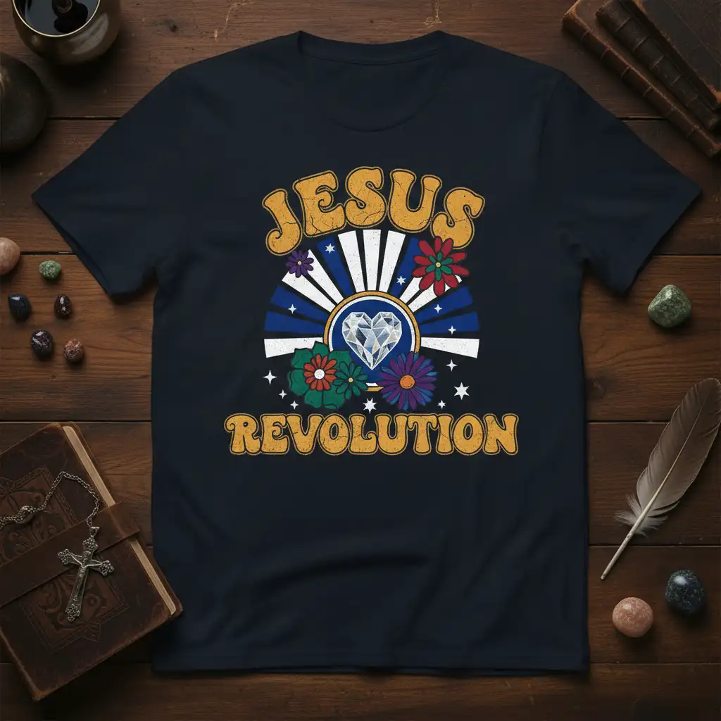 This unique Jesus Revolution t-shirt is designed to capture the essence of faith with a distinct retro vibe. The prominent “Jesus Revolution” text is rendered in a bold, stylized font that harks back to classic design eras. It is complemented by a vibrant sunburst graphic, symbolizing enlightenment and divine presence. The design is further enhanced by a sparkling heart emblem and colorful floral elements, adding a touch of beauty and positivity.