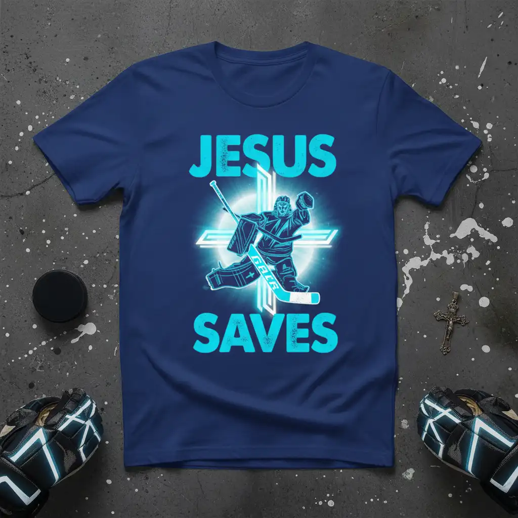 This design prominently features the powerful message “Jesus Saves” in vibrant, eye-catching lettering. The central image showcases a determined hockey goalie, expertly positioned within a glowing cross. This symbolic representation merges the divine act of saving with the crucial role of a goalie on the ice, making it a profound statement for those who find strength in their faith. The clean lines and bold graphics ensure the message is clear and impactful, appealing to anyone who cherishes both their spiritual journey and their love for hockey.