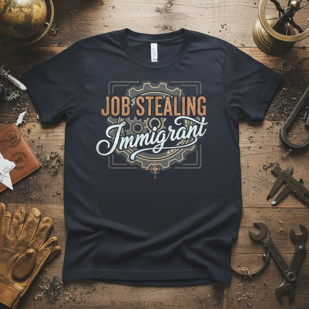 The “JOB STEALING Immigrant” slogan is a witty and defiant response to common misconceptions, reframing the narrative with humor and confidence. It’s designed for comfort and style, making it a perfect addition to any casual wardrobe. This shirt is not just about wearing a message; it’s about embodying the spirit of ambition and success.