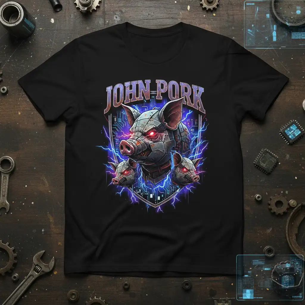 This unique graphic tee showcases the JOHN-PORK name prominently above a stunning depiction of a robotic pig. The design blends the raw power of a swine with the cold, hard edges of advanced technology. Electric blue lightning crackles around the cybernetic pig’s head, highlighting its menacing red eyes and intricate metallic plating.