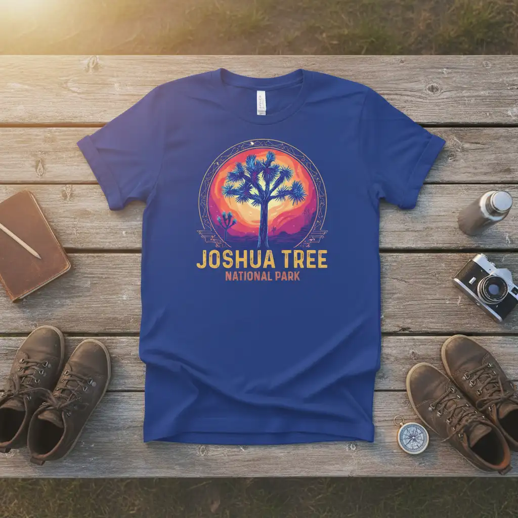 The Joshua Tree National Park t-shirt showcases the park’s most recognizable feature, the Joshua tree itself, set against a vibrant, artistic sunset. This design is crafted to resonate with those who have explored its vast expanses or dream of doing so. It serves as a tribute to the unique ecosystem and the awe-inspiring vistas that make this park a must-visit destination for nature enthusiasts and photographers alike.