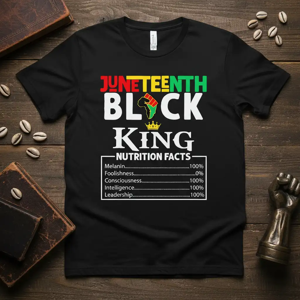 JUNETEENTH BLACK KING NUTRITION FACTS Melanin 100% Foolishness 0% Consciousness 100% Intelligence 100% Leadership 100%, this t-shirt is more than just apparel; it’s a statement of pride, heritage, and identity. Designed to resonate with the spirit of Juneteenth, it celebrates the strength, wisdom, and resilience embodied by Black Kings everywhere. The unique “nutrition facts” format offers a playful yet powerful way to highlight the essential qualities that define greatness. Perfect for wearing to celebrations, gatherings, or as a daily reminder of inherent worth and power.