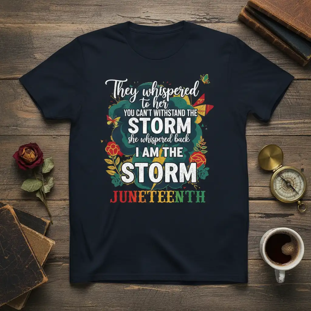 They whispered to her YOU CAN’T WITHSTAND THE STORM she whispered back I AM THE STORM JUNETEENTH, making this t-shirt a powerful symbol of resilience and inner strength. This design captures the spirit of Juneteenth, celebrating freedom, heritage, and the unwavering power within. It’s more than just apparel; it’s a statement of pride and empowerment, perfect for commemorating this significant day. The vibrant colors and bold typography ensure this message resonates with everyone who wears it.