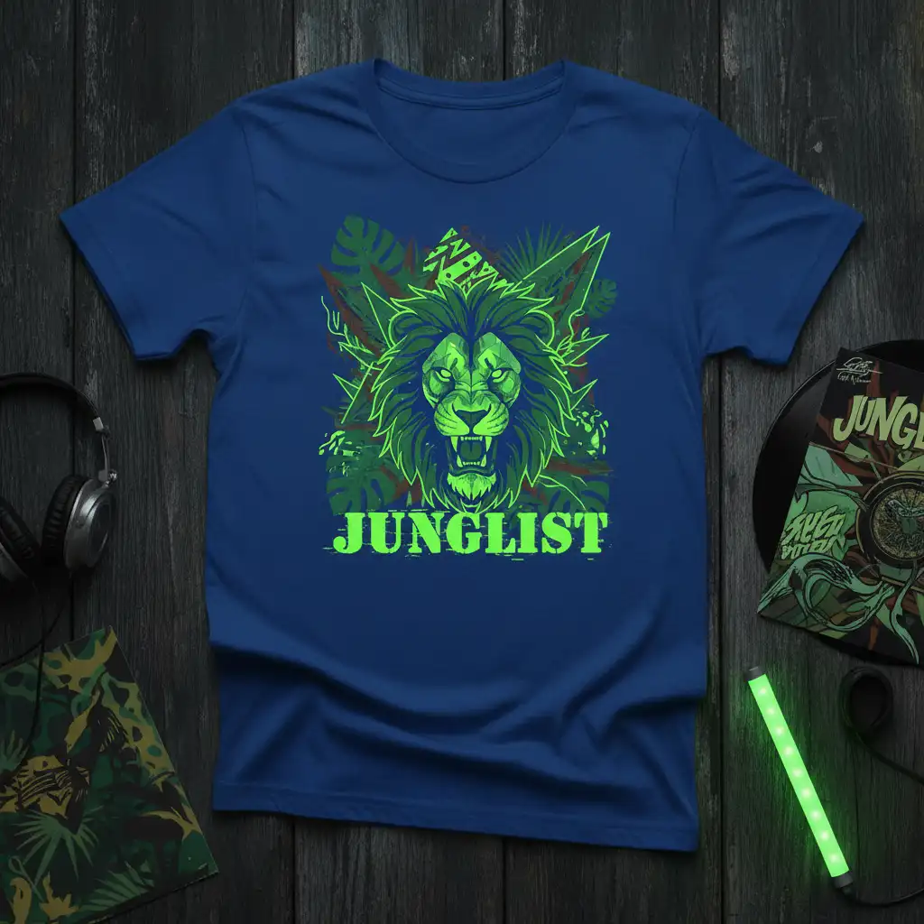 The vibrant neon green against the deep blue fabric creates a visually arresting effect, reminiscent of the electric atmosphere of a live set or a late-night rave. Every detail, from the sharp lines of the lion’s face to the textured leaves, is crafted to immerse the wearer in the jungle aesthetic. This t-shirt isn’t just clothing; it’s a badge of honor for those dedicated to the genre.