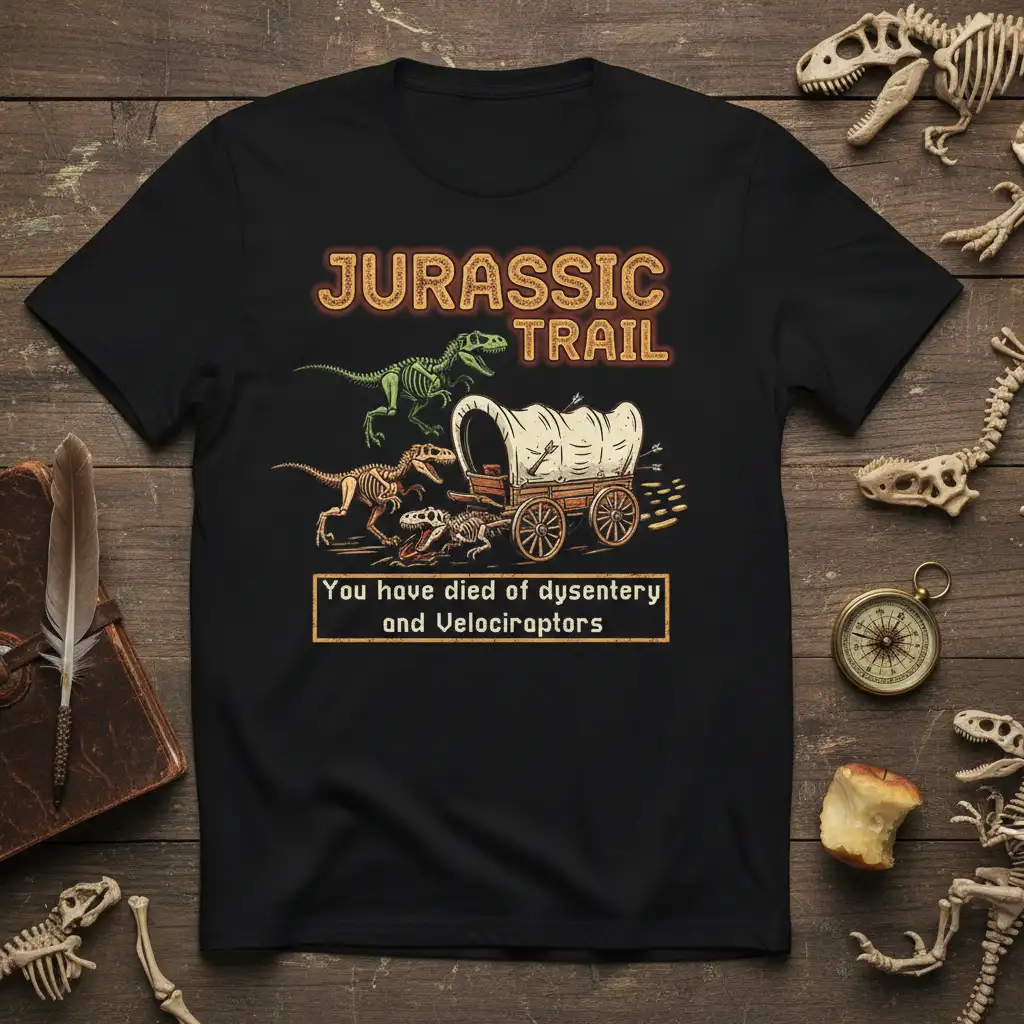 This hilarious t-shirt, featuring the “You Have Died of Dysentery and Velociraptors” quote, is a must-have for anyone with a quirky sense of humor and a love for dinosaurs. Crafted for comfort and durability, it’s a fantastic conversation starter and a unique gift idea for friends and family. Show off your love for all things Jurassic with this eye-catching design.