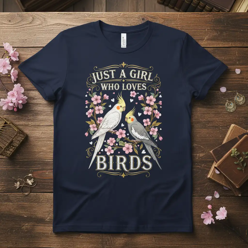Just A Girl Who Loves Birds! This sentiment is beautifully captured on our premium t-shirt, designed for those who find joy and companionship in their feathered friends. The intricate artwork features two charming cockatiels nestled amongst a vibrant floral arrangement, creating a visually stunning piece that speaks volumes about your passion. It’s more than just a shirt; it’s a declaration of love for all things avian, perfect for everyday wear or as a thoughtful gift.