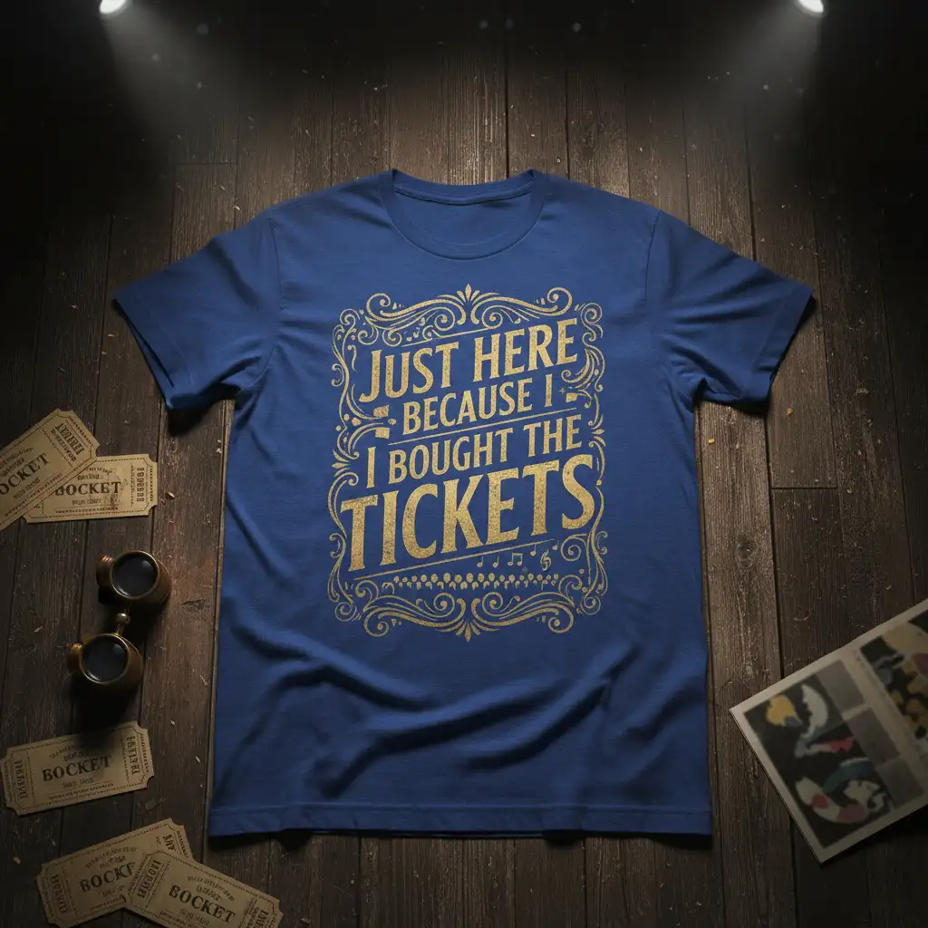 The phrase “Just Here Because I Bought The Tickets” is a witty and direct way to express your commitment to experiencing the event firsthand. It’s a perfect icebreaker for meeting fellow enthusiasts and sharing your passion for live entertainment. This shirt is designed to be a conversation starter, connecting you with others who share your love for concerts, shows, and memorable outings.