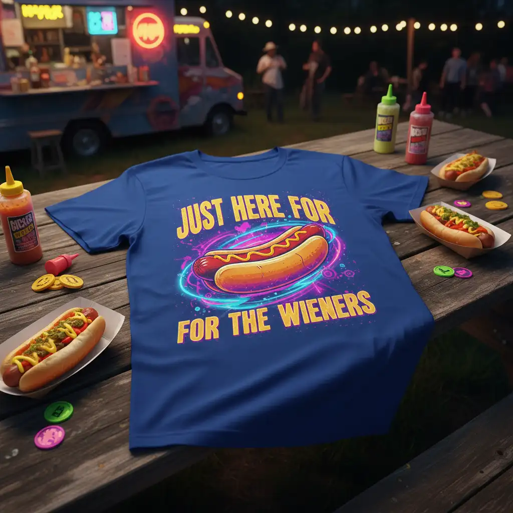 This JUST HERE FOR THE WIENERS design’s electric blue and neon glow elements evoke the fun and excitement of outdoor gatherings and vibrant summer evenings. This t-shirt is crafted with high-quality materials for maximum comfort and durability, ensuring it remains a favorite in your collection for seasons to come. It’s designed to be as enjoyable to wear as a perfectly cooked hot dog is to eat.