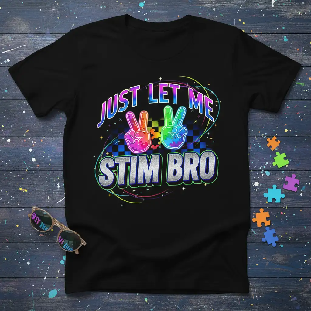 JUST LET ME STIM BRO proudly declares acceptance and understanding on this eye-catching t-shirt. Designed for those who embrace neurodiversity, this shirt features a vibrant, colorful aesthetic that celebrates individuality. It’s more than just apparel; it’s a statement of support and a symbol of belonging for brothers, friends, and advocates. Let this tee spread a message of positivity and awareness wherever it’s worn.