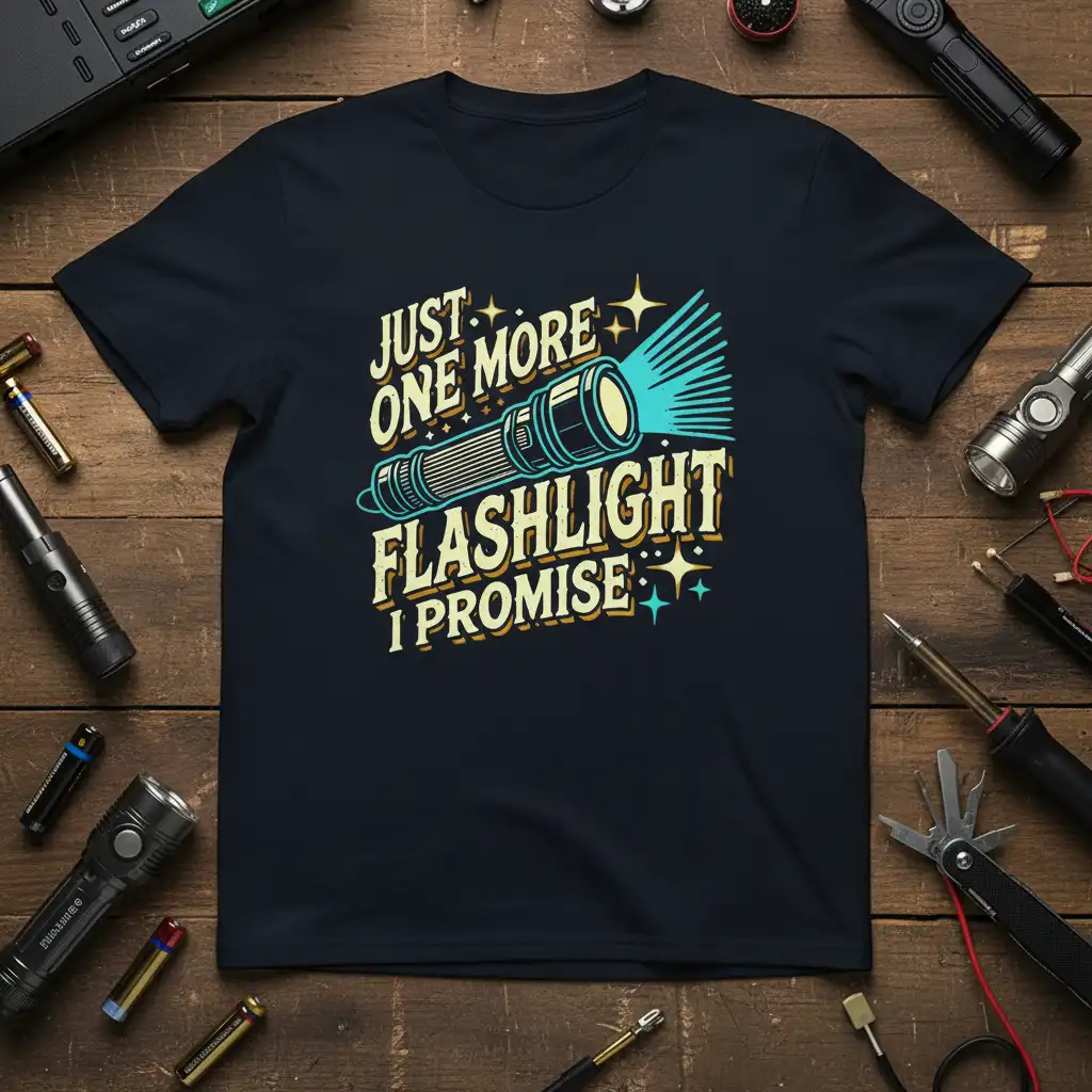 Don’t miss out on this opportunity to own or gift a t-shirt that truly speaks to the heart of a flashlight collector. This JUST ONE MORE FLASHLIGHT I PROMISE design combines a humorous, relatable message with a stylish, retro design, making it a standout piece. It’s crafted for comfort and durability, ensuring you can wear your passion proudly for years to come. Whether you’re adding it to your own collection or giving it to a fellow enthusiast, this tee is sure to be a hit. Click ‘Add to Cart’ now and let the world know about your enduring love for flashlights!