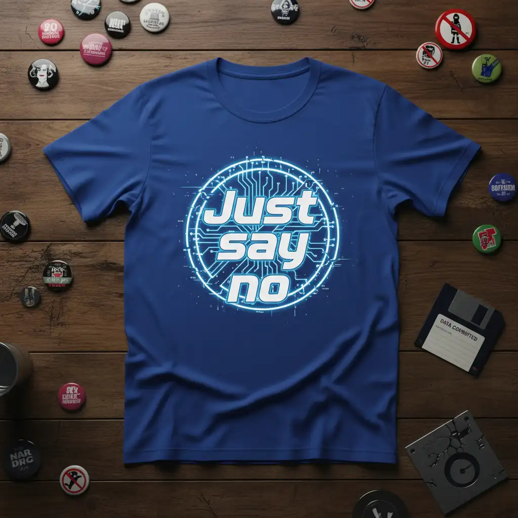 Dive back into the vibrant spirit of the 1980s with this retro-inspired graphic tee. The “Just Say No” slogan was a significant cultural touchstone, and this shirt revives its powerful message with a modern, digital twist. The glowing circuit board design adds a futuristic element, making it a unique interpretation of a classic phrase. It’s an excellent choice for themed parties, casual outings, or simply as a distinctive addition to your collection.