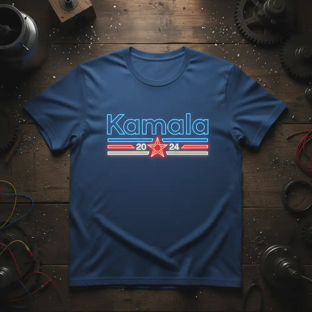 Show your dedication to the Kamala Harris campaign with this distinctive t-shirt. The design features “Kamala” in a vibrant, neon-style font, flanked by “20” and “24” and a prominent red star, symbolizing a strong political stance. This apparel is crafted for comfort and durability, making it an excellent choice for long days at political events or everyday wear.