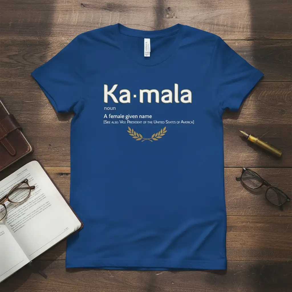 This distinctive t-shirt features the name “Ka·mala” presented as a dictionary entry. It humorously defines it as “A female given name” and then adds the crucial clarification, “[See ALSO: VICE PRESIDENT OF THE UNITED STATES OF AMERICA]”. This design is a clever and direct way to honor the current Vice President. It resonates with supporters and those who appreciate political commentary through fashion.