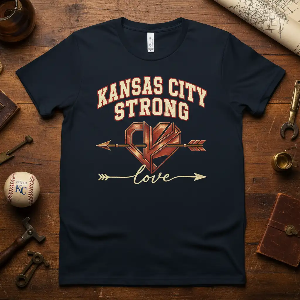 The design features the powerful phrase “Kansas City Strong” coupled with a symbolic heart and the word “love,” representing an unbreakable connection to the city. This tee is perfect for anyone who wants to display their allegiance and admiration for Kansas City’s unique culture and resilience. It’s a conversation starter and a badge of honor.