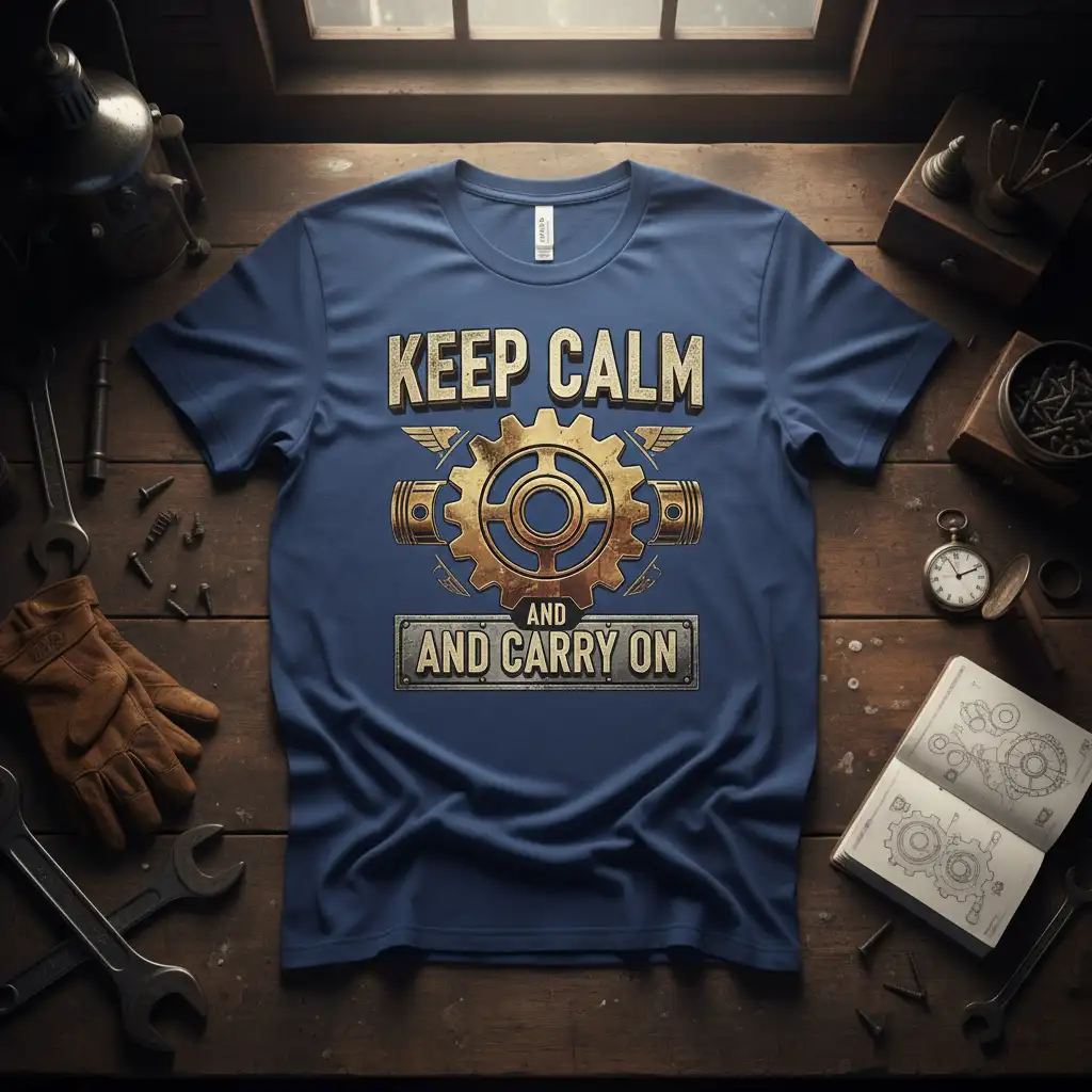 Beyond its visual appeal, the message of “Keep Calm And Carry On” offers a sense of encouragement and steadfastness. It’s a fitting motto for anyone who faces challenges with a cool head and a determined spirit, much like the precision required in mechanical work. This t-shirt is a constant reminder to maintain composure and persevere, making it a source of daily inspiration.