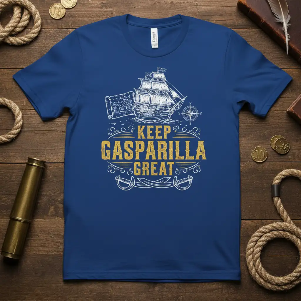 KEEP GASPARILLA GREAT, this iconic slogan is emblazoned on this premium t-shirt, designed for those who embody the adventurous spirit of the Gasparilla Pirate Festival. This shirt isn’t just apparel; it’s a statement piece that celebrates Tampa Bay’s most legendary event. With its vintage-inspired design featuring a majestic pirate ship, a detailed map, and crossed sabers, it perfectly captures the thrill and excitement of pirate lore. Wear it to the parade, to parties, or anywhere you want to show your pride for this unforgettable celebration.