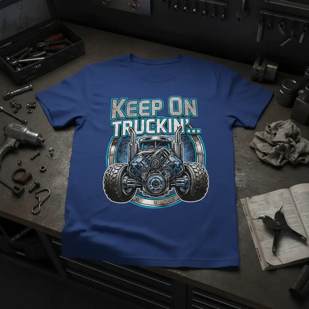 Don’t miss out on owning this exceptional piece of trucking apparel. The “Keep On Truckin’…” t-shirt is designed to be a durable, comfortable, and stylish representation of the trucking spirit. It’s the perfect way to showcase your passion for the open road and the powerful machines that conquer it. Order yours today and keep the wheels of your wardrobe turning with this fantastic graphic tee!