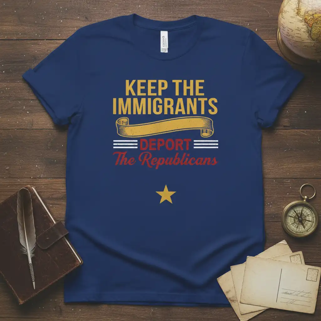 KEEP THE IMMIGRANTS DEPORT The Republicans statement tee is designed for those who want to express their political views with clarity and conviction. This shirt is more than just apparel; it’s a wearable declaration of your stance on immigration and political matters. Crafted with high-quality materials, it ensures comfort and durability for everyday wear, allowing you to advocate for your beliefs with confidence. It’s the perfect way to initiate dialogues and showcase your commitment to your principles. This design aims to resonate with a specific audience passionate about policy and social commentary.