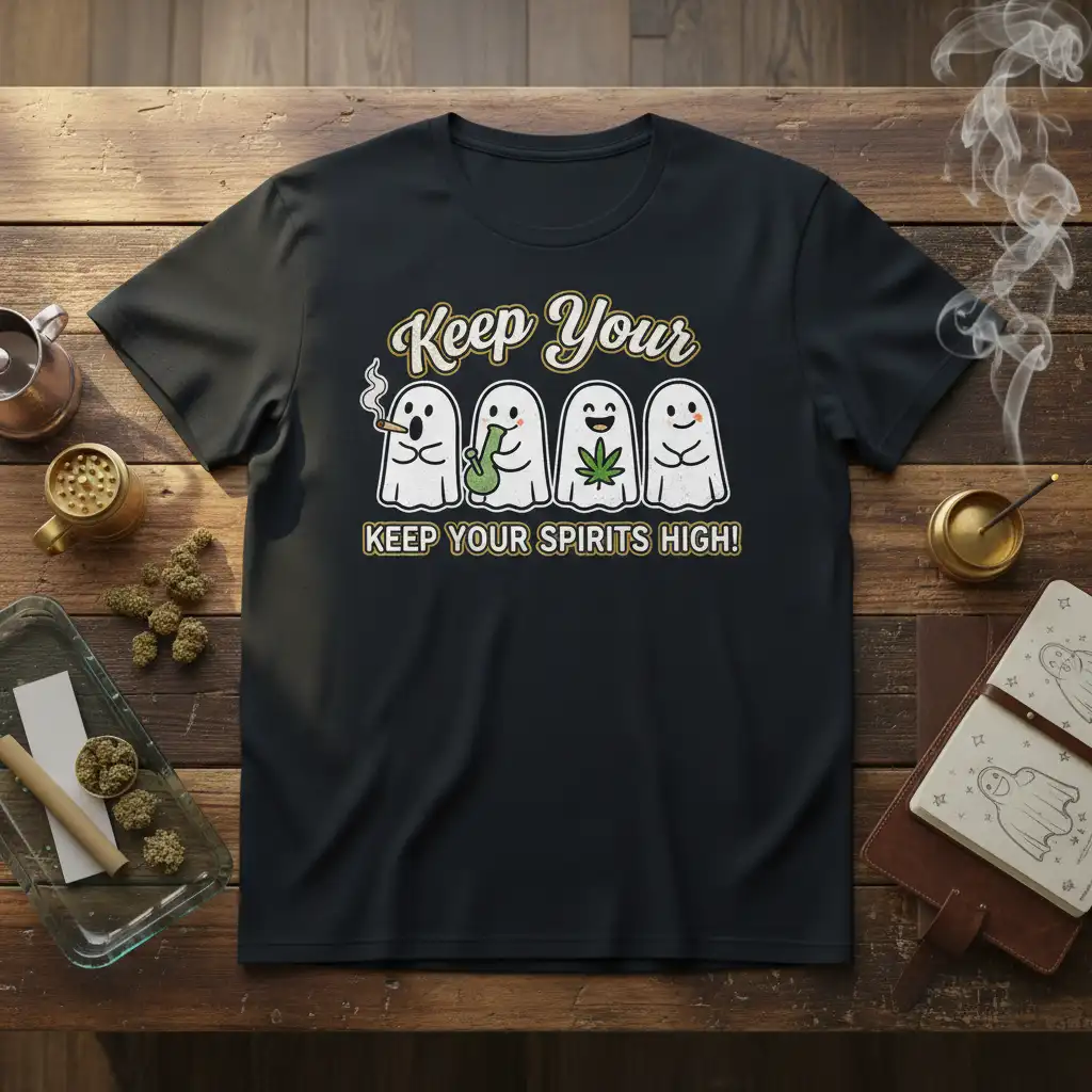 This eye-catching t-shirt showcases a delightful crew of cartoon ghosts, each designed to evoke a sense of playful mischief and good cheer. One ghost is shown enjoying a smoke, another happily holds a bong, and a third proudly displays a cannabis leaf, while the fourth offers a friendly wave. The accompanying text, “Keep Your Spirits High!”, perfectly encapsulates the carefree and celebratory vibe of the design. It’s an ideal garment for those who appreciate clever wordplay and a unique graphic that stands out from the crowd.