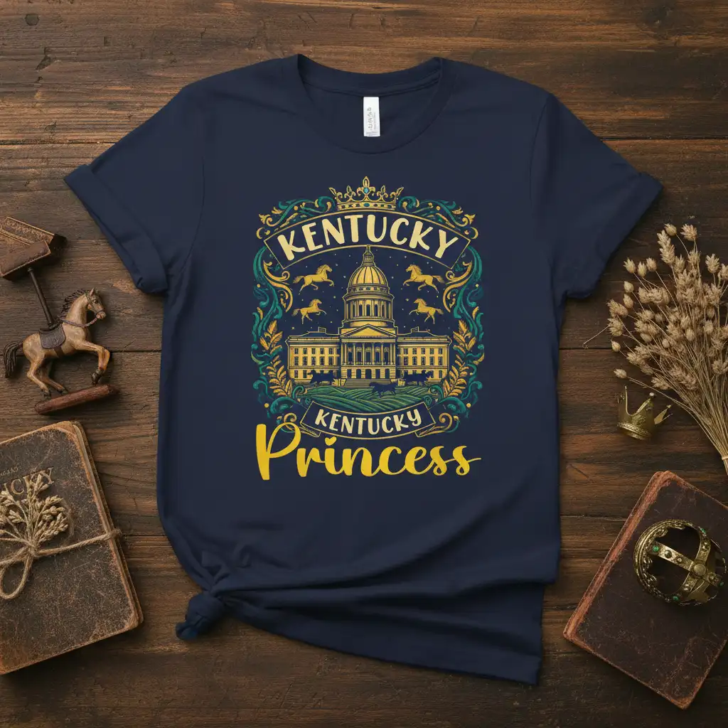 Pick from Black, Navy, Royal, Dark Heather, Red, and White to match your mood and wardrobe staples. Each colorway keeps the Kentucky Princess design clear and photo-ready for everyday wear.