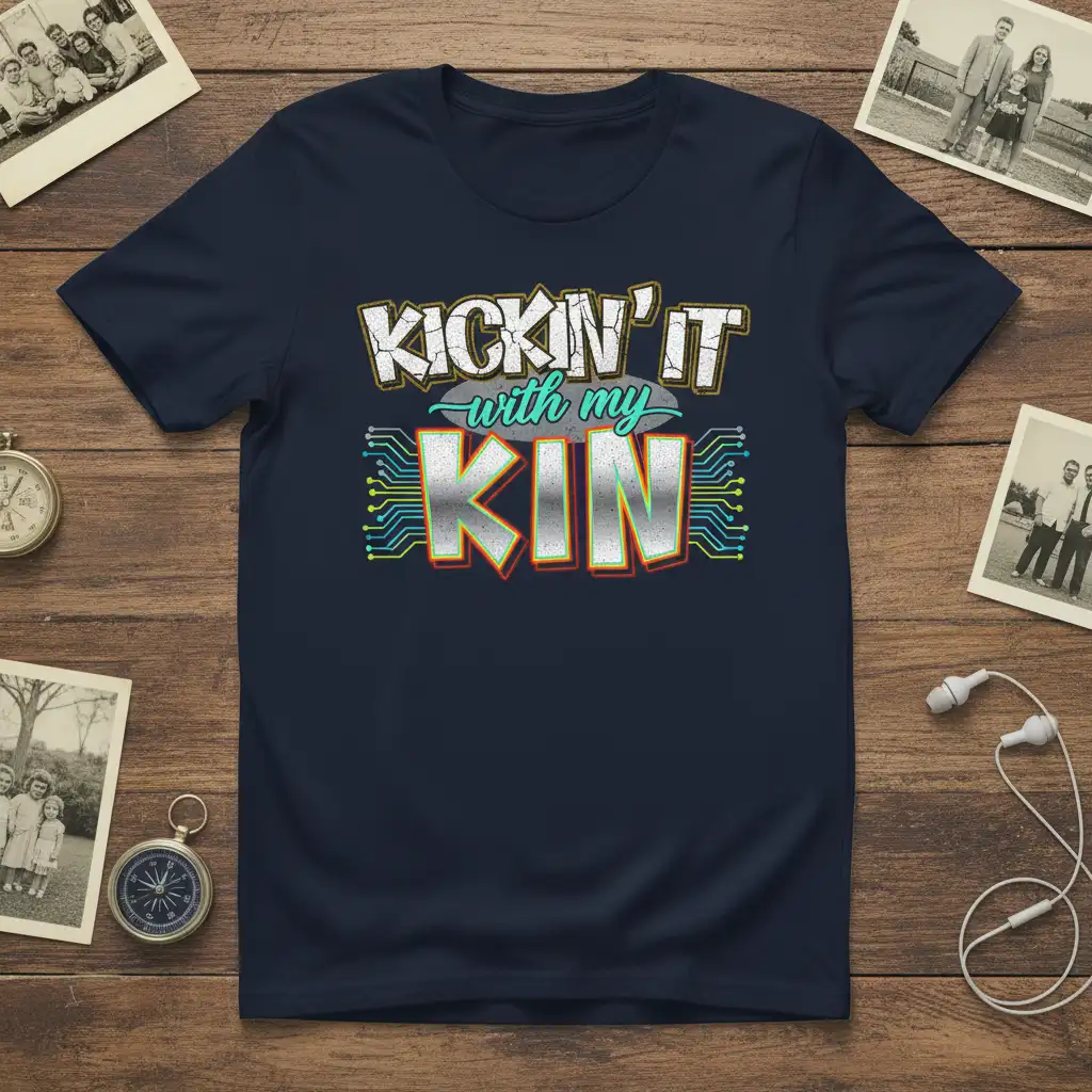 This t-shirt is designed for those who cherish their family and enjoy spending quality time with their relatives. The phrase “Kickin’ It With My Kin” is rendered in a playful, retro font, complemented by a modern circuit board graphic. This combination symbolizes the blend of tradition and contemporary life that many families experience today.