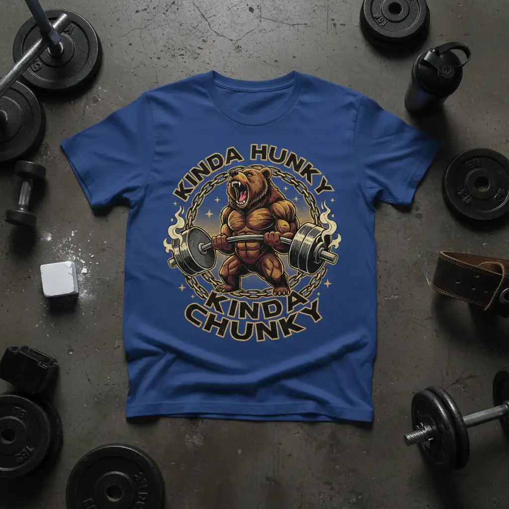 The bold typography clearly states “KINDA HUNKY KINDA CHUNKY,” a witty and relatable phrase for anyone who appreciates both the aesthetics of fitness and the reality of hard work. This t-shirt isn’t just apparel; it’s a conversation starter and a badge of honor for those who dedicate themselves to their training routines. It’s designed to inspire confidence and camaraderie among fellow gym enthusiasts.