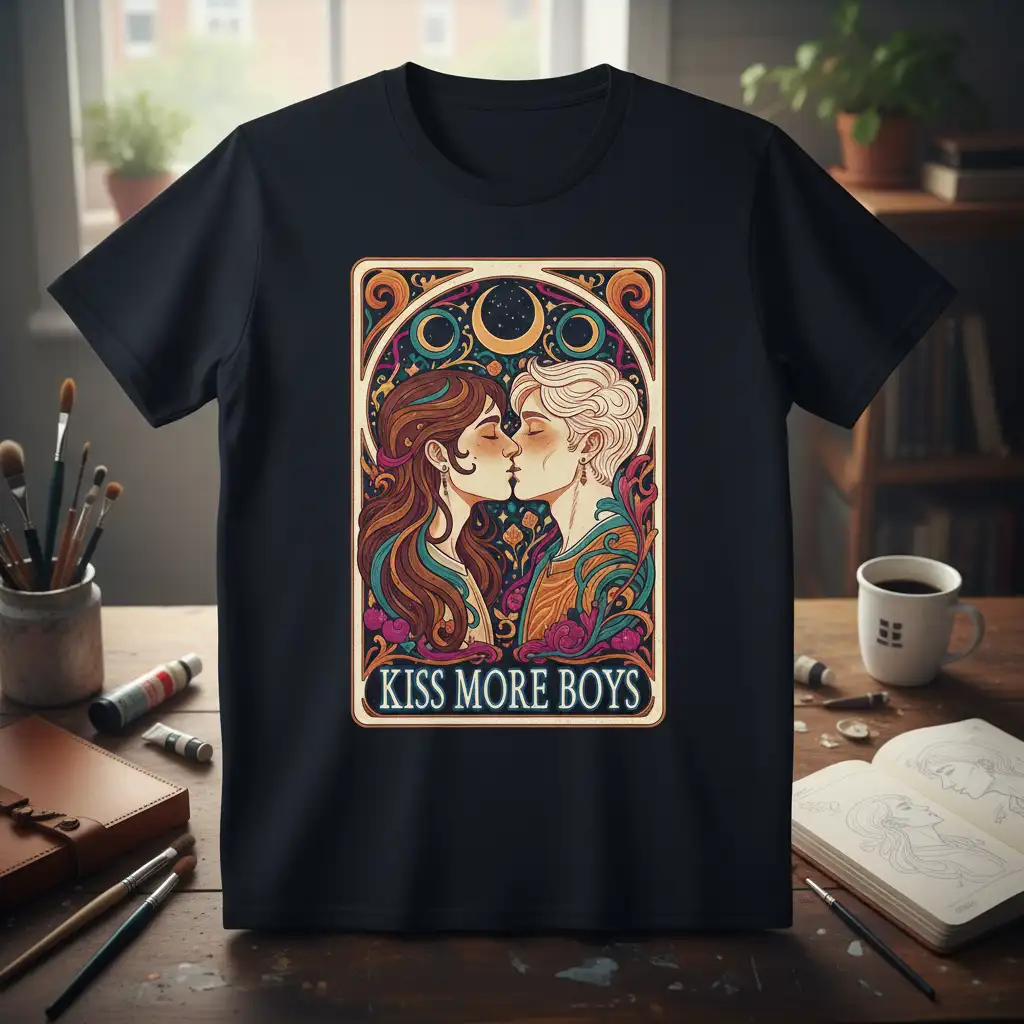 The Kiss More Boys t-shirt is crafted for those who wish to wear their pride openly and stylishly. The artistic rendering, reminiscent of classic tarot cards, brings a touch of mystique and enchantment to the design. This piece is perfect for Pride parades, festivals, or everyday wear, allowing you to showcase your support and love for the LGBTQ community.