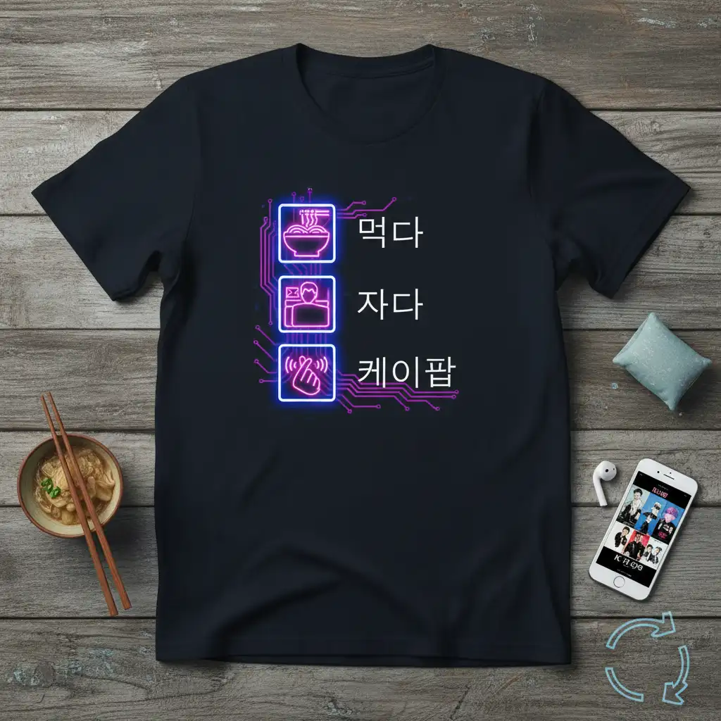This “먹다 자다 케이팝” t-shirt is crafted for those who live and breathe K-Pop. The design combines three essential elements of a fan’s life: enjoying delicious Korean food (먹다), getting much-needed rest (자다), and, of course, immersing themselves in K-Pop (케이팝). The striking neon-style graphics and circuit board motif add a modern, digital aesthetic that resonates with today’s fandom culture.