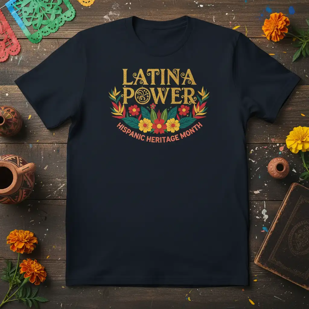 This t-shirt is designed to be a centerpiece for Hispanic Heritage Month celebrations. It features bold, eye-catching typography that proudly declares “Latina Power.” This Latina Power Hispanic Heritage Month design is further enhanced with a beautiful array of colorful flowers and leaves, symbolizing growth, vitality, and the natural beauty of Hispanic cultures. It’s a perfect way to express your cultural pride and support for the Latina community.