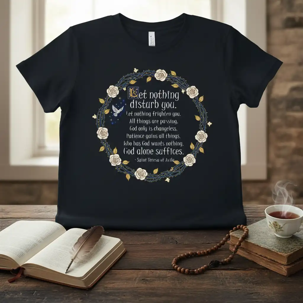 Let nothing disturb you. Let nothing frighten you. All things are passing. God only is changeless. Patience gains all things. Who has God wants nothing. God alone suffices. -Saint Teresa of Avila. This powerful quote, attributed to the revered Saint Teresa of Avila, is beautifully presented on this comfortable and stylish t-shirt. It serves as a constant, gentle reminder to seek inner peace and steadfastness, regardless of external circumstances. The elegant design encapsulates the essence of spiritual resilience, making it more than just apparel, but a wearable affirmation of faith and tranquility.