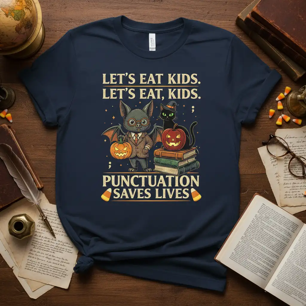 Don’t let a misplaced comma cause chaos! This “Punctuation Saves Lives” t-shirt is a fun and stylish way to advocate for the importance of grammar. Whether you’re attending a Halloween event, teaching a class, or just hanging out, this tee is sure to make a statement. Get ready to share a laugh and spread the word about the power of punctuation. Order yours today and become a punctuation hero!