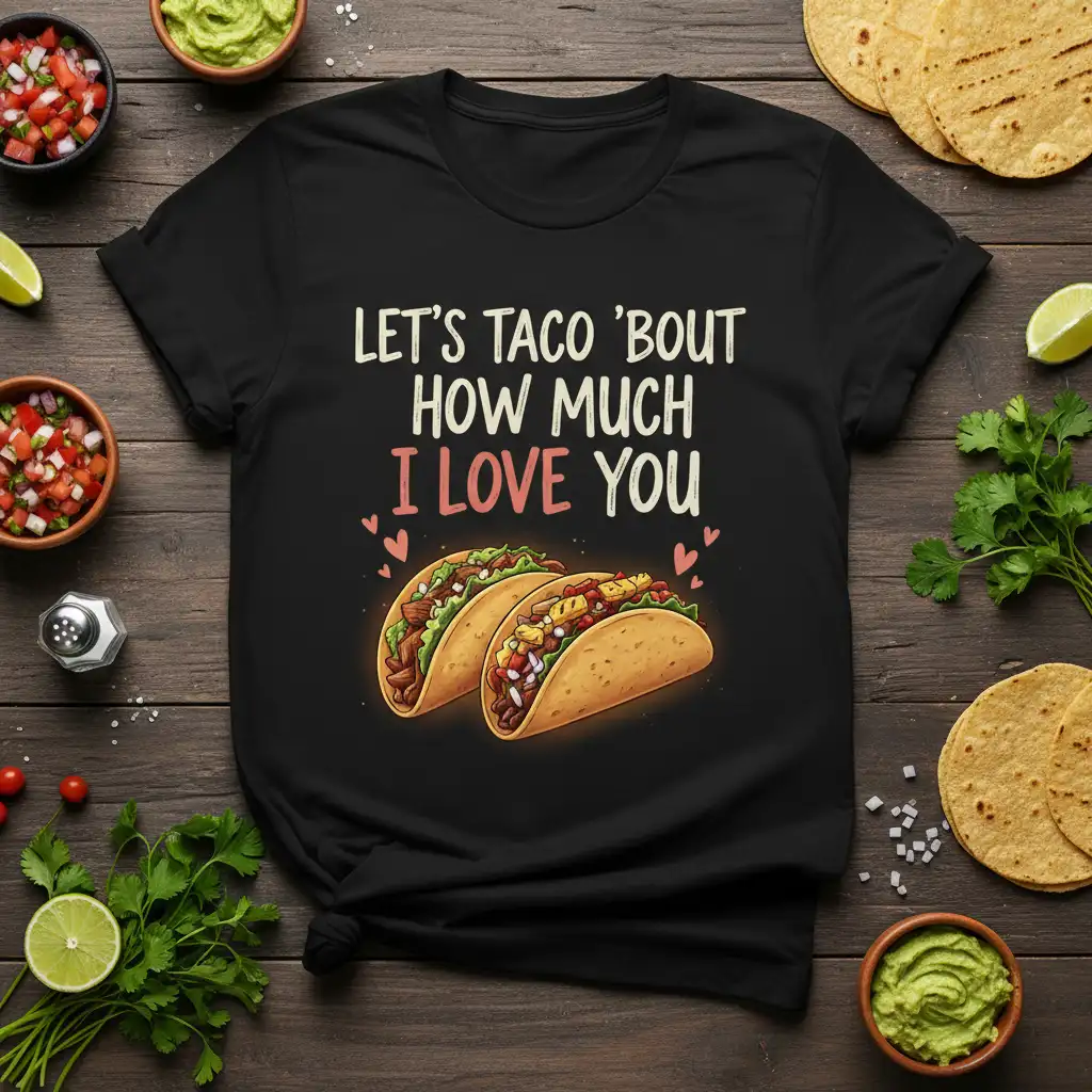 Let’s taco ’bout how much I love you with this incredibly charming and fun t-shirt design. This apparel piece is perfect for expressing affection in a unique and memorable way, blending a popular food item with heartfelt sentiment. It’s an ideal choice for couples, foodies, or anyone who appreciates a good pun and a delicious taco. The design is crafted to bring a smile to your face and to the face of the person you give it to. Show your loved one just how much they mean to you with this delightful and conversation-starting tee. It’s more than just clothing; it’s a statement of love and appreciation.