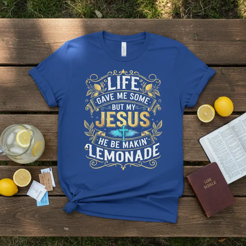 This unique t-shirt offers a wonderful way to express your spiritual journey and share a message of hope and resilience. The blend of faith-based messaging with a creative twist makes it a standout piece in any casual wardrobe. Embrace the power of positivity and the strength of your beliefs by wearing this inspiring design. It’s a perfect reminder that with faith, you can indeed make lemonade out of life’s lemons. Order yours today and let your spirit shine!