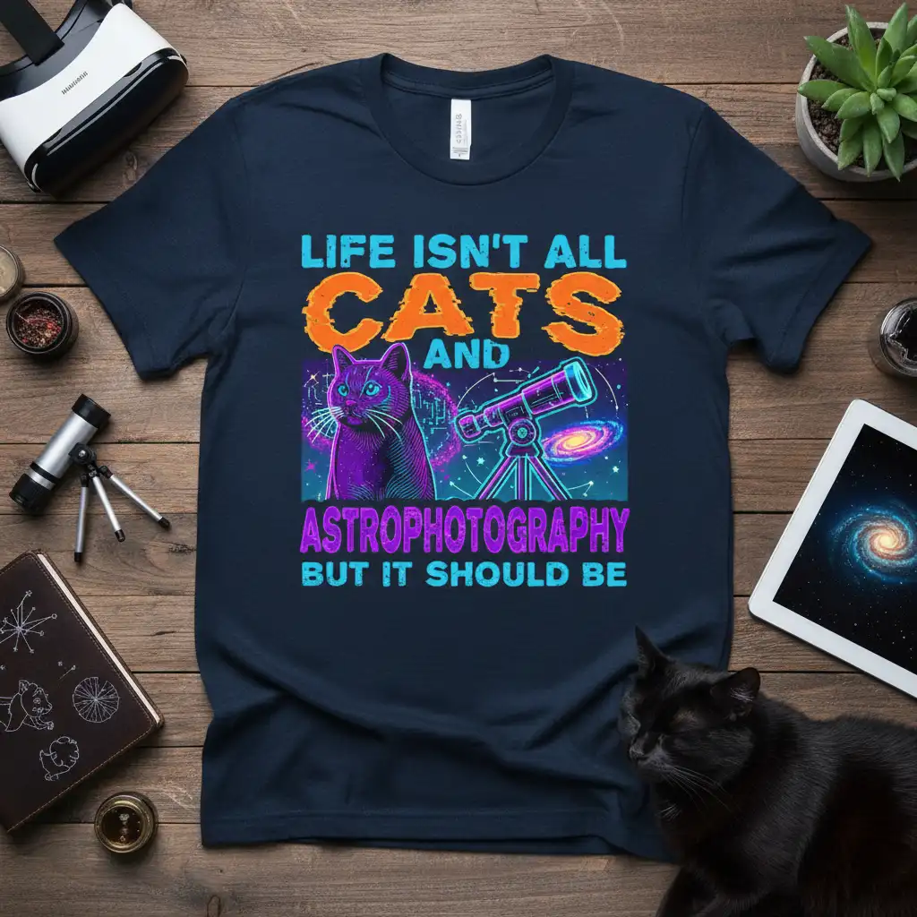 This “Life Isn’t All Cats And Astrophotography But It Should Be” tee is your invitation to wear your passions proudly. It’s a reminder that life is richer when filled with the things we love, whether it’s the gentle purr of a cat or the awe-inspiring beauty of the universe captured through astrophotography. This shirt is designed to be a conversation starter, a source of joy, and a comfortable staple in your wardrobe. Don’t miss out on this chance to own a piece that truly represents your unique interests and your love for all things feline and cosmic – grab yours today!